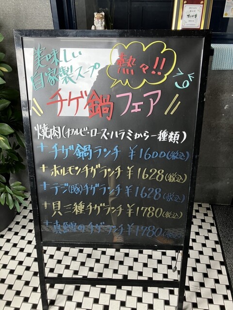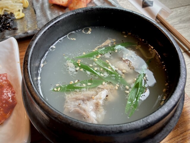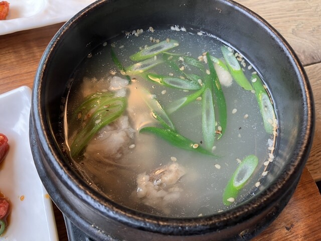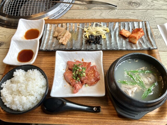 12時で事前予約しており、その少し前に入店です。やや奥のボックス席へ着座。また来月にリニューアルオープンするとは言え、現状下での最後だと思うと、やはり名残惜しい感覚になります。で、今回のオーダーは、「焼肉(=ロースを選択)+テールスープのランチ(@1,680円税込)。」連れ合いは「Caglaハラミランチ(@1,580円税込)」を選択。