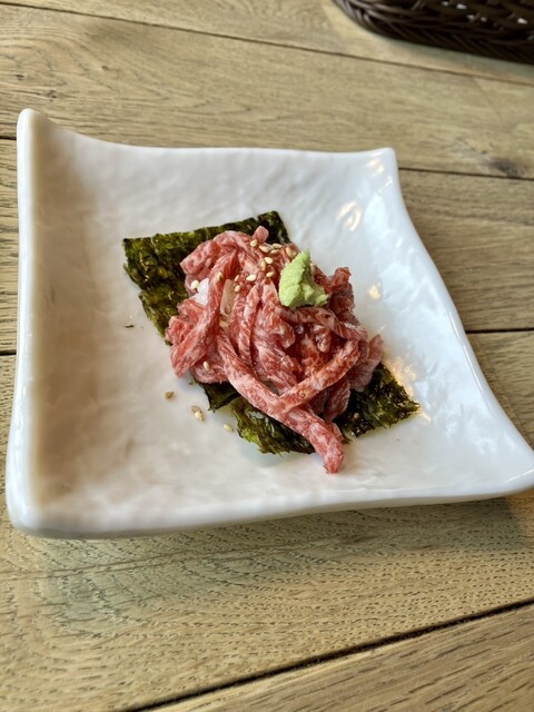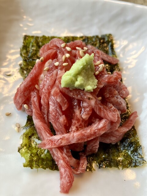 定刻になって入店し、例の親切なオニイサンの案内で奥の方の窓側ボックス席に着座。誕生月のプレゼントクーポンを使って、ユッケの巻寿司一貫をサービスで先に頂きました。柔らかく美味しい新鮮なユッケがたっぷりの逸品でした。^ ^