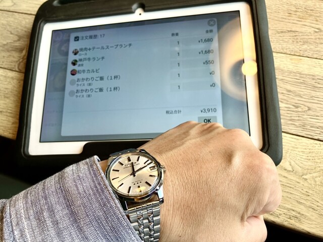 今回は何を頼もうか色々思案しましたが、私は「神戸牛ランチ(@1,680円税込)」と、追加で肉の日のスペシャル価格となっている「和牛カルビ(@550円税込)」を、連れ合いはお気に入りの「焼肉(= ロースを選択)+テールスープのランチ(@1,680円税込)」を、タブレットで各自オーダー。