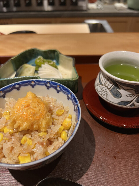 最後に醤油味のとうもろこしごはん黄身の天ぷらをのせて、やられました〜美味しいに決まってます。