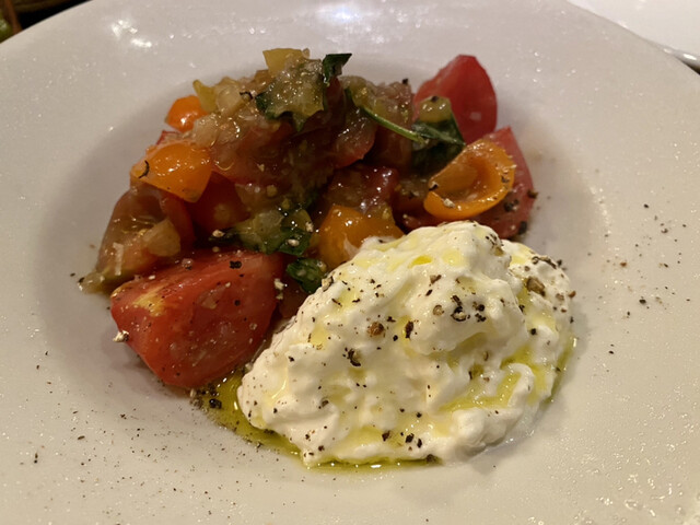 ブッラータとトマトのサラダは、ドレッシングにあえられたひんやりトマトがとても美味しかった
