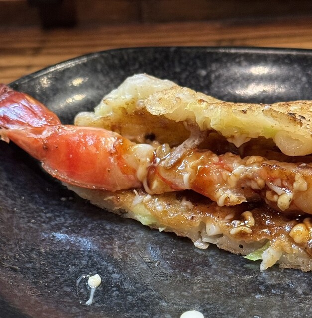 立派な1本エビを、薄焼きにしたイカ焼きで挟む、びっくりしためっちゃ「粉モン」なメニュー