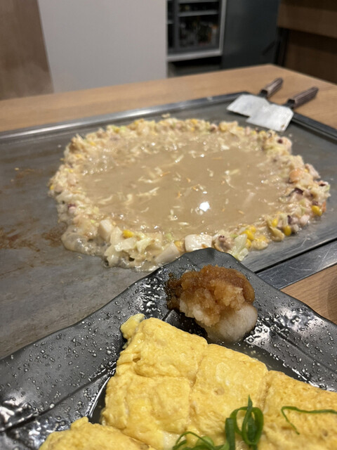 だし汁とキャベツと具材、、、、シンプルと思いきや、出来上がりまでの工程と、鉄板の熱量による焼き具合で味変が常に持続する、、、、サステナビリティ、、何とも奥深い!また食べたい(^O^)❒
