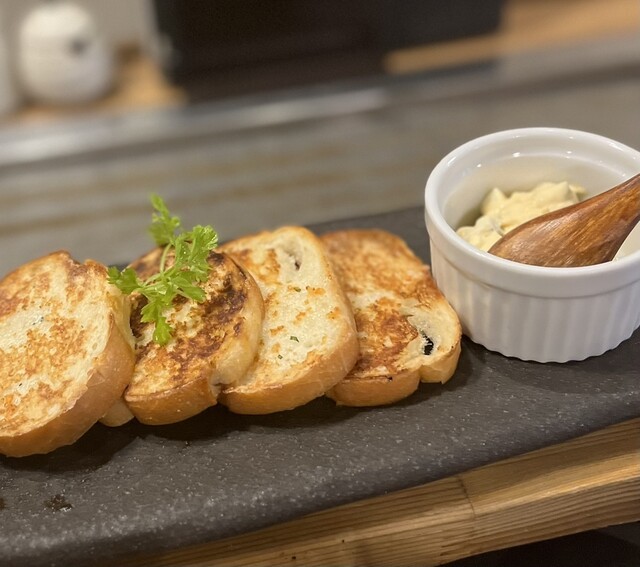 初の「海老パン」はフランスパンのバゲットに海老ソースをかけてソテーして、お店こだわりのタルタルソースでいただく、めっちゃ美味しい1品 (≧◡≦)