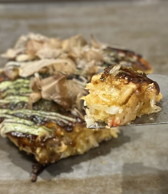 ふんわり感、、、、さて、カリカリ豚はお好み焼きのどこにあるでしょうか♪( ´θ`)ノ