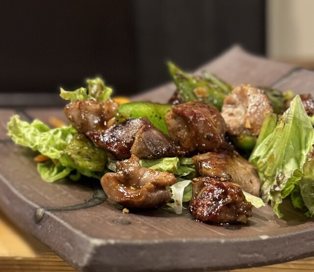 ほんのりソースの味付けの、ガーリックピーマンといただくズリがおしゃれで美味しい