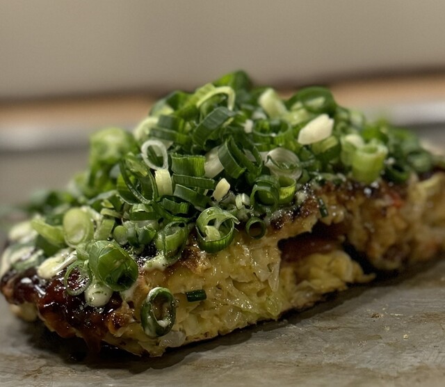 そして、これまた「ひいろ」さんでしか味わえないフワフワで高さのある、生地がほんのりと甘い黄金のお好み焼き(豚と油カス)、、、、油カスの味が濃い目でGOOD!