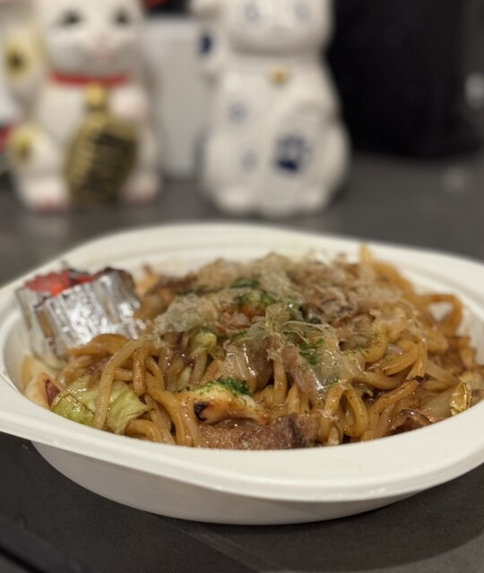 テイクアウトの「ミックス焼きそば」現地で食べるのがいちばんですが、持ち帰っても(∩˃ ᵕ ˂∩)うまい!厚めの豚肉、プリっとしたエビとイカ、玉ねぎの甘みとキャベツ!全部の具材のバランスがめっちゃ好き