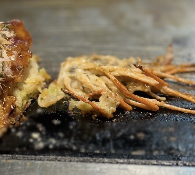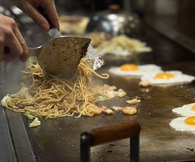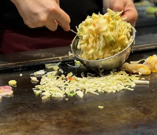 「お好み」焼いてる熱々鉄板に運ばれてくるから