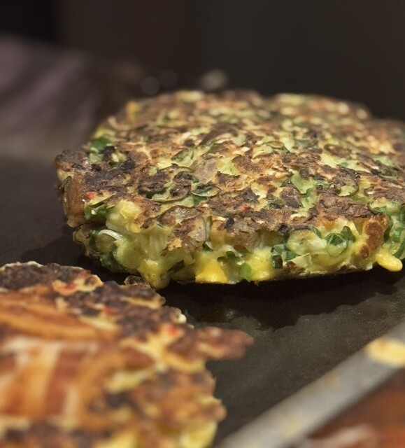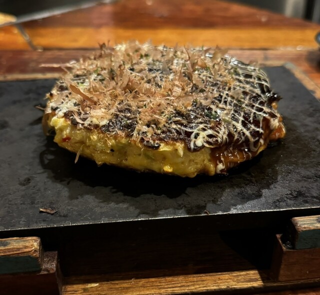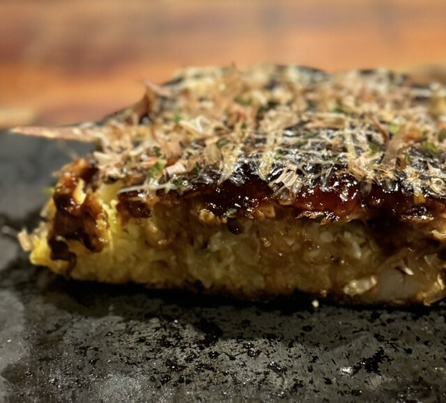 「Moegi」さんのふかふかお好み焼き、キムチ入りなので少し色が濃い目