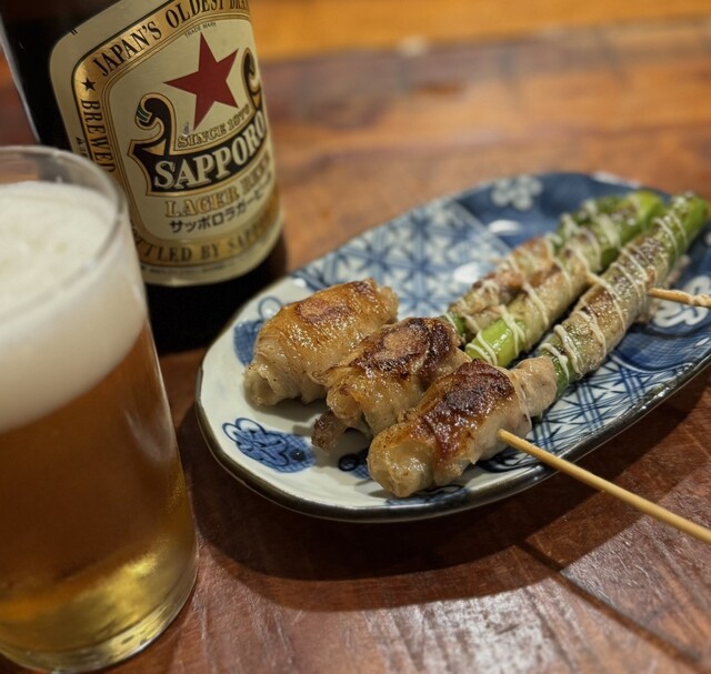 もちろん「ねぎ焼き(豚)」とビールのあてに「極太アスパラのホイル焼き」と「甘海老のかき揚げ風なんちゃら」を注文