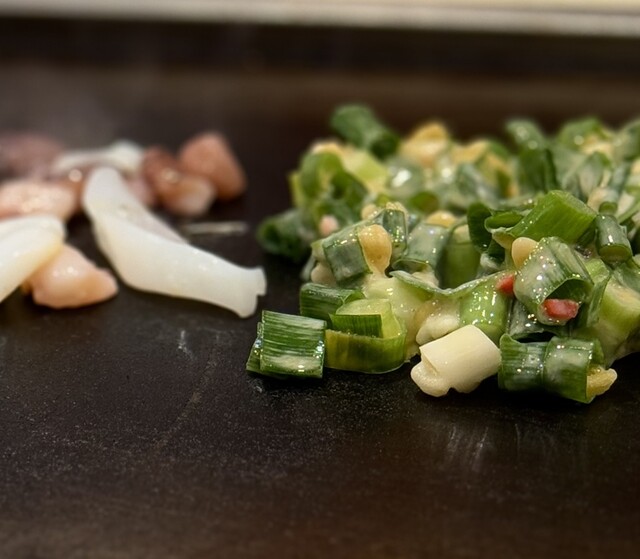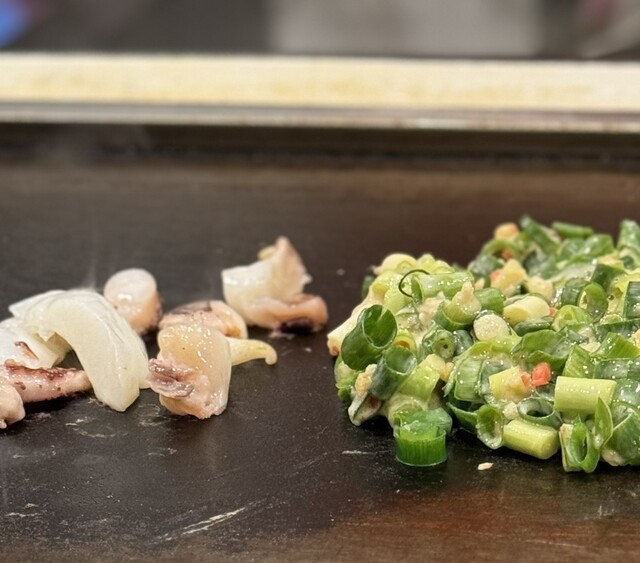 今宵私がいただいたのは こちらの「ねぎ焼き(イカ・豚)」(^O^)❒’’ しかぁーーーし!隣の方の スジねぎ焼きもやばかった