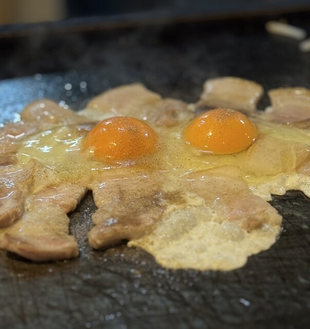 こんがり焼けた豚肉と、目玉焼きのお焦げが芳ばしい