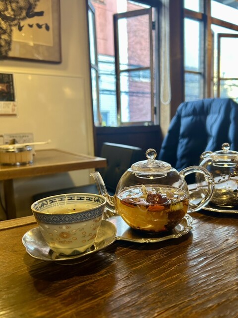 馬車道から中華街まで歩き、目指すはこちらの「悟空茶荘」。1階は中国茶の販売、2階が茶館(カフェ)になっています。到着時は5組待ちでしたが、30分ほどで呼び出しがあり2階へ。店内は昭和レトロで落ち着いた、お洒落な空間が広がっています。