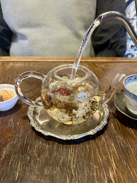 八宝茶は悟空オリジナルブレンドで、見た目も華やか。氷砂糖が入っているので、二煎目まではほんのりとした甘みを楽しめます。