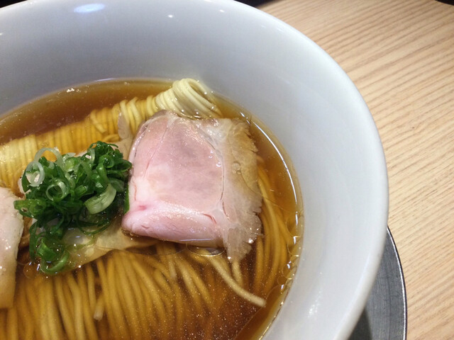 透き通ったたスープに、美しく折り畳まれた白っぽい麺の上に、豚肉と鶏肉の3種類のチャーシュー、青ねぎと、鶏チャーシューの上にすりおろしの柚子がトッピングされています。