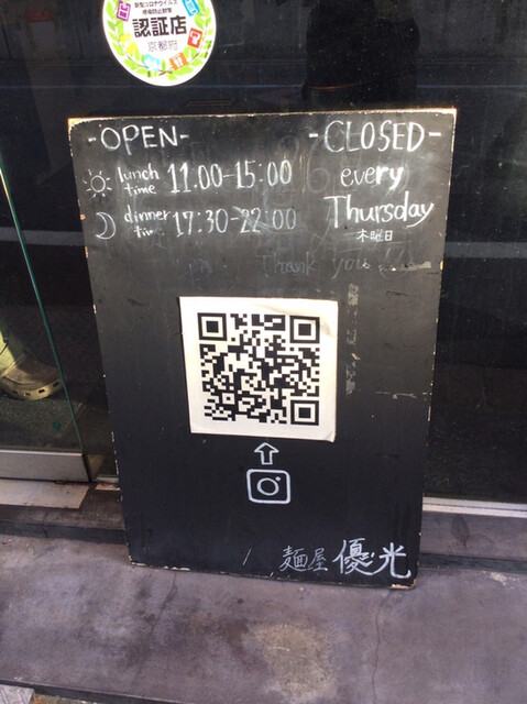 白い外壁と、インスタグラムのQRコードが表示された[麺屋優光]と書かれた黒板が目印です。
