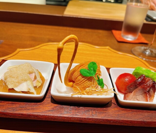 1品目の伊達鶏を使用した蒸し鶏は最高ランクのクラゲと一緒にスペシャリテの白鳥のパイ点心も美味しい焼豚も少量ながら旨みがしっかり