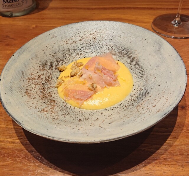 バターナッツ南瓜のポタージュ仕立て。南瓜の自然な甘みに水牛リコッタがコクをプラスし、また薄くスライスした生ハムの塩みとのバランスが絶妙◎