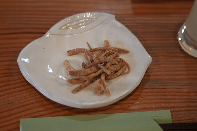 まずは食前のリンゴジュースがでてきます。それから、揚げそば、ごま豆腐、花豆、生ひじきの酢の物、豚肉の煮物が出ました。最後にそばなのですが、鴨つけそばにも変更ができます。まずはそばだけをいただきます。石臼挽きで香りがいいですね。
