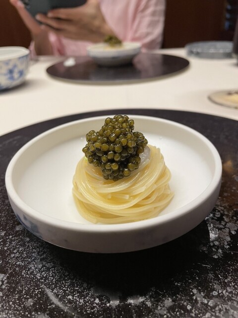冷製パスタ。麺は塩とオリーブのみ、上に白海老、キャビア。塩味、旨味、甘味の調和が取れていてコクのあるパスタ。なるほど(`・ω・´)。