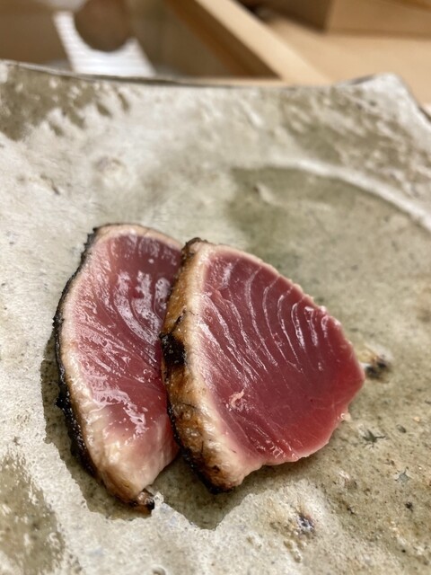 カツオのタタキ。藁で燻したカツオは辛子醤油で。