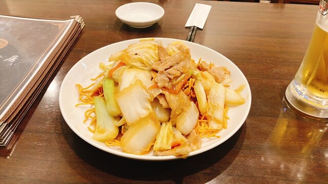 あんかけ揚げそば、中華でよくある、中華鍋の上で麺を揚げるやつ。ベビースターみたいな太い麺に、野菜入り餡がたっぷり。