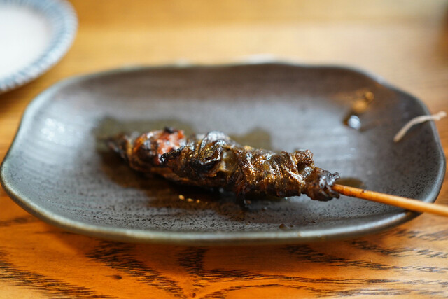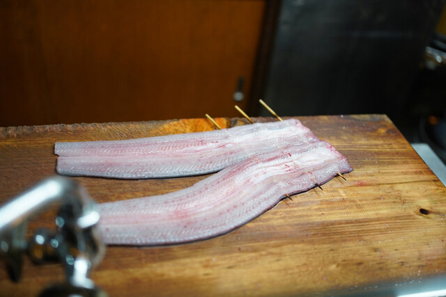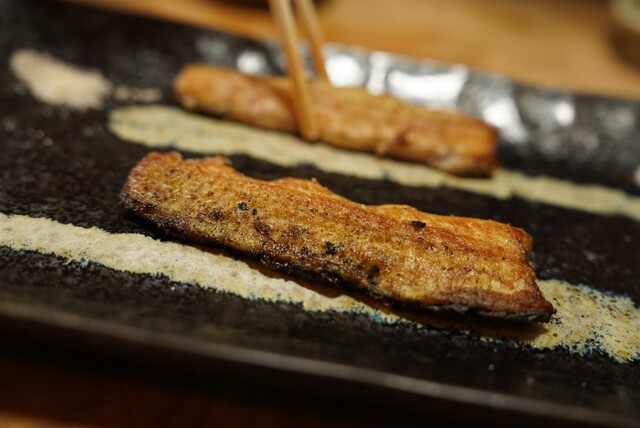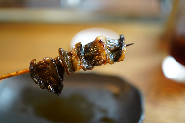 肝焼きは養殖と天然の食べ比べ。甲乙つけ難いが、苦味の違いがはっきりします。天然の方が更に華やかな苦味。噛んだ時の気持ち良い弾力も全然変わります。