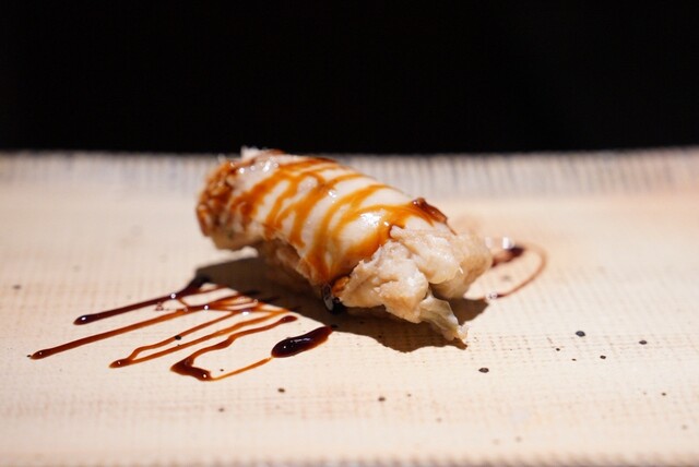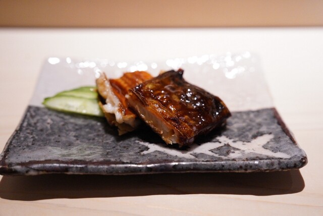 皮目だけを炙った焼き穴子。タレが飴状で歯にまとわりつく...