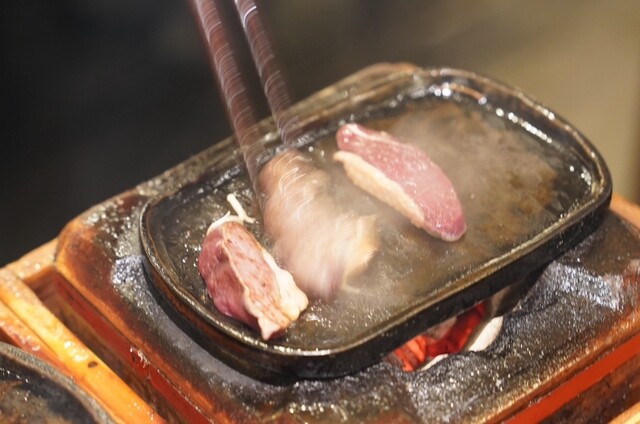 その熱を溜め込んだ鷹匠鍋で鴨肉を焼くと旨味成分が瞬時に閉じ込められ、何とも贅沢な味わいとなります