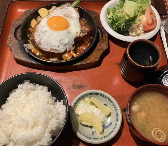 鉄板にのっていてふわふわのハンバーグ。ハンバーグの下にフライドポテト、インゲン、トウモロコシ、にんじんのグラッセ!もぅ、ハンバーグ定食の王道!