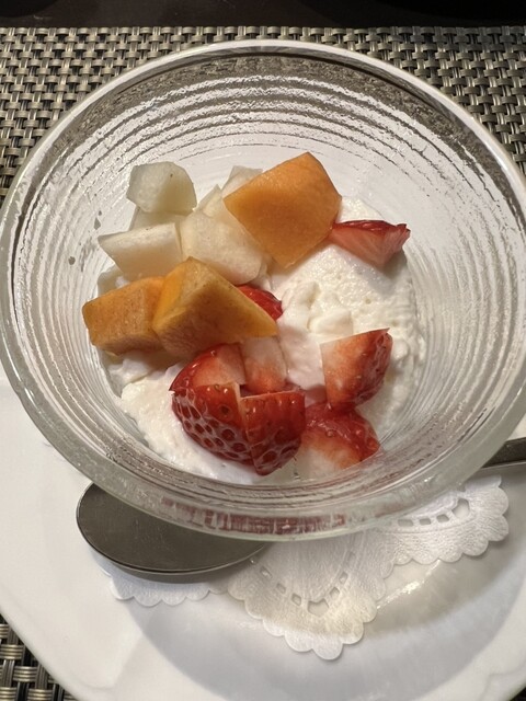 杏仁豆腐には柿とシャインマスカット トロッとした杏仁豆腐が一瞬で消えてなくなります
