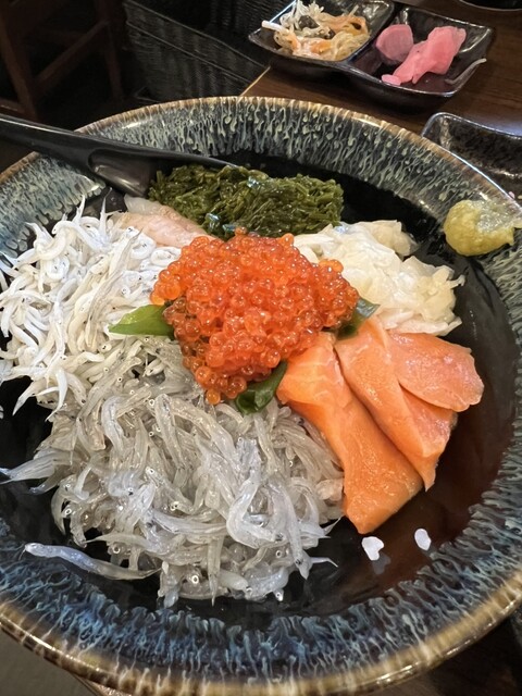 釜揚げしらす、生しらす、サーモン、甘エビ、貝、めかぶ が乗っています