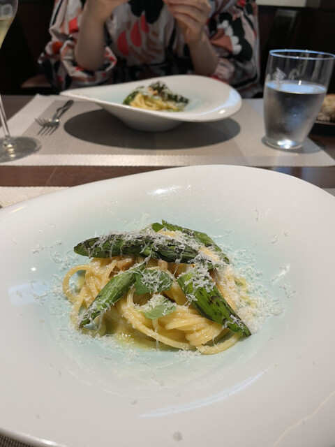 こだわりの採れたて水分たっぷり、シャキシャキ食感なアスパラガスを使ったパスタは上からかかっているパルメザンチーズがいいアクセントでグッド