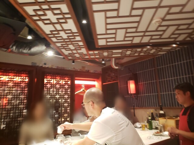 中華っぽい照明がまたオシャレ。田中シェフの鍋さばきが見られる席でガン見してました。