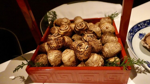 シルクロードを通じてワインを飲んでいたという説がある楊貴妃。おそらくワイン発祥のオレンジワインを飲んでいたであろうというシェフの考察のもと、オレンジワインで煮込んだ鮑の料理。