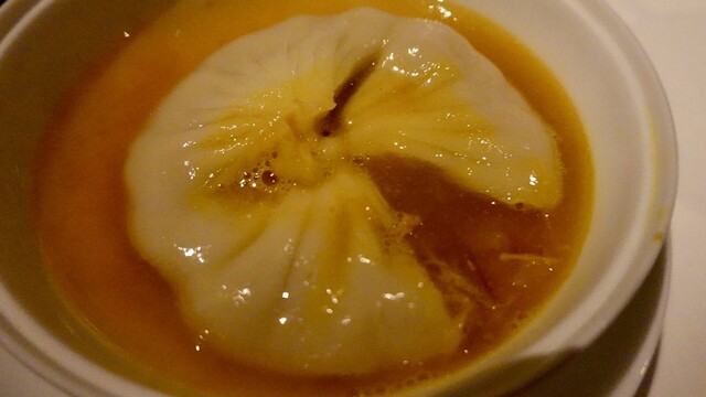 烏骨鶏の清湯スープを楽しんでからスープ饅頭を割れば中から毛蟹、フカヒレ、蟹味噌のエキスがジュワっと溢れる。