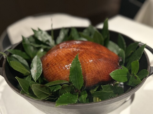茨城産「かすみ鴨」。パイナップル、ジョージア産オレンジワイン、唐辛子でピリ辛の味付け。