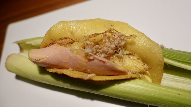 中にヤングコーン、トリュフ、トウモロコシ2種類のピューレ、フォアグラのテリーヌ、サマートリュフ。