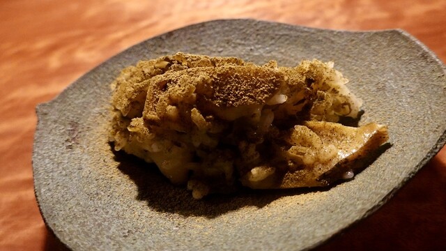 馬肉の味が凄くきれいで脂の甘味、玄米の旨味とエゴマの香りが見事な調和をはかる。