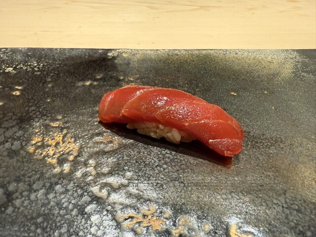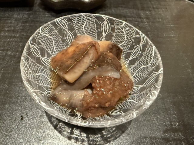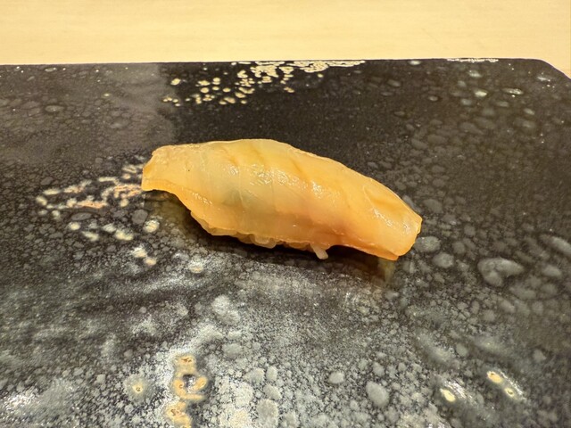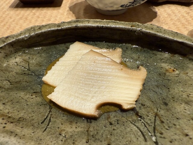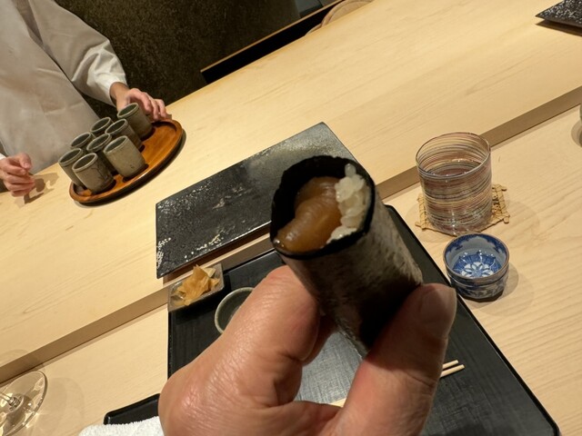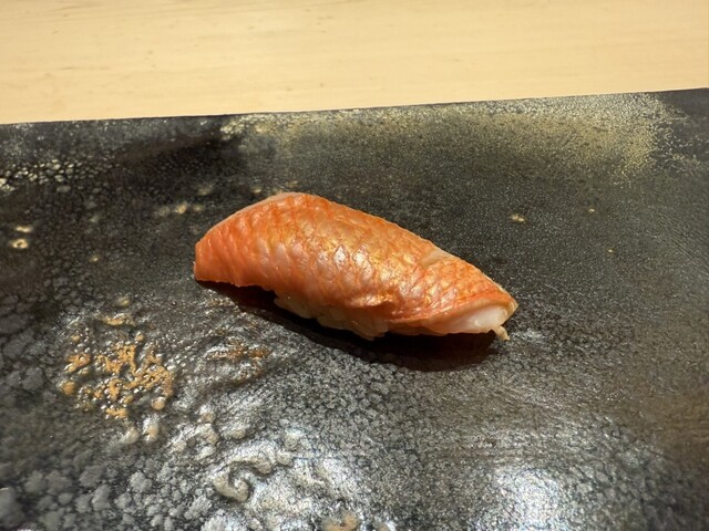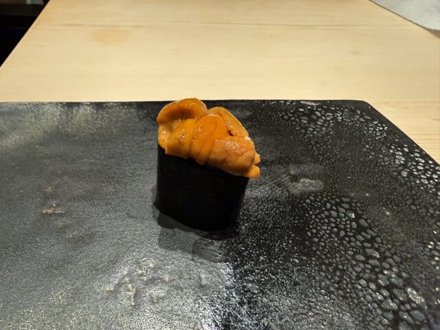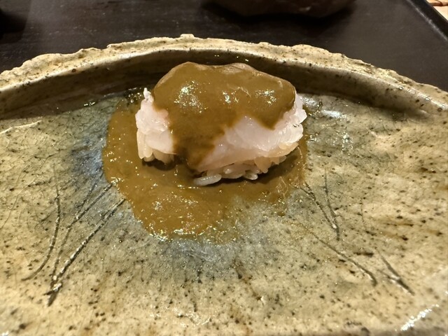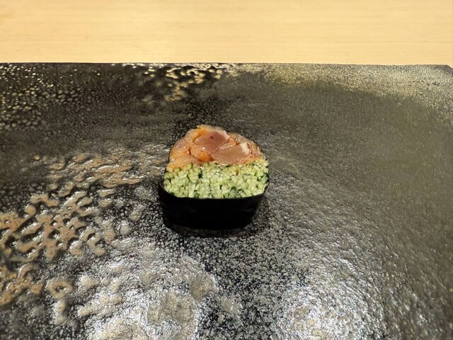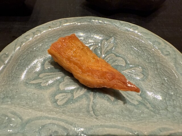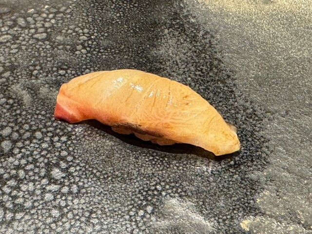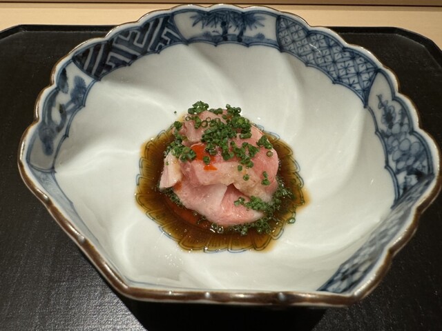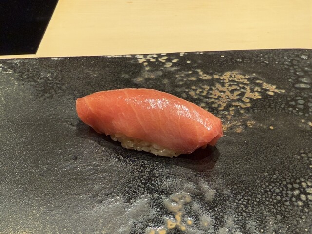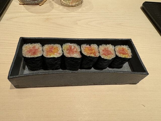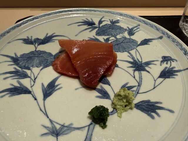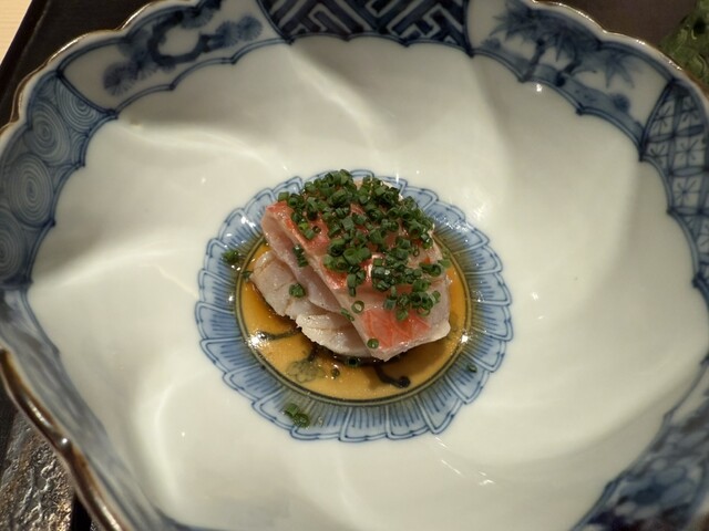 ヤイトガツオ、鰆、河豚の唐揚げと煮凝り、鰯、カワハギ、海鼠、鮟肝と柿、唐墨、小肌、天然車海老、越前蟹の茶碗蒸し、赤貝、馬糞雲丹、大トロ、赤身、中トロ、車海老の頭、雲子、干瓢巻き、スープ、卵焼き