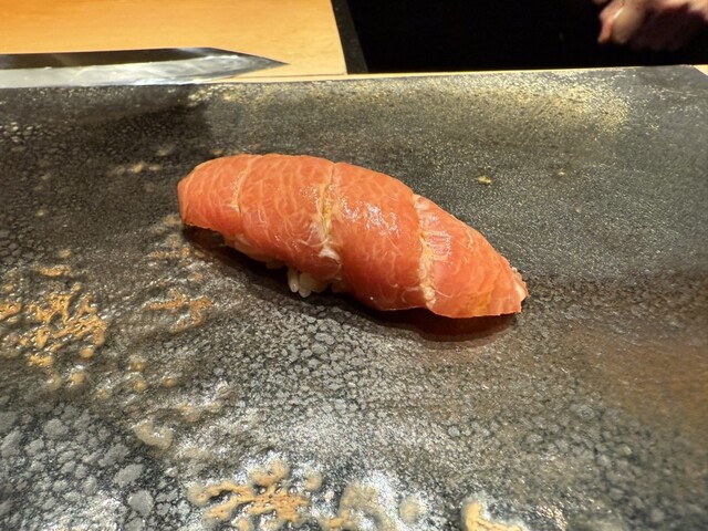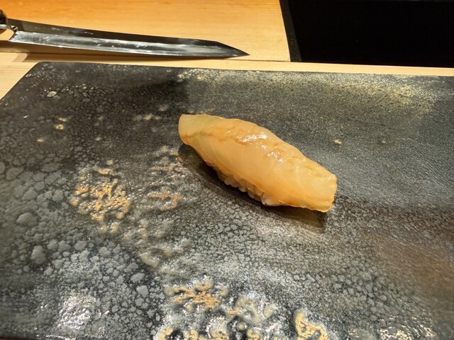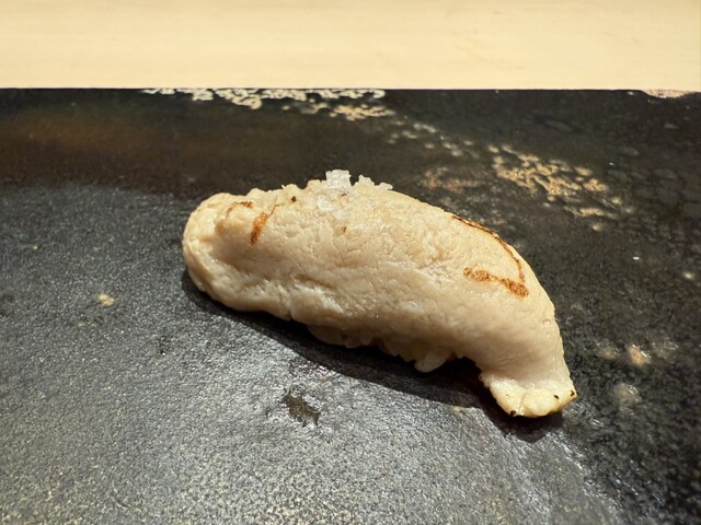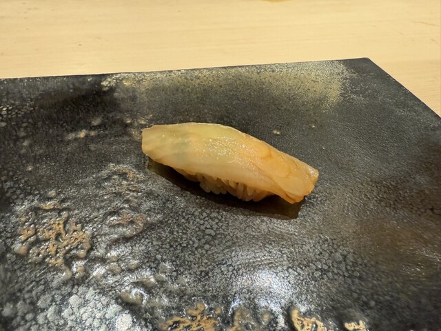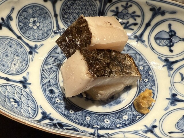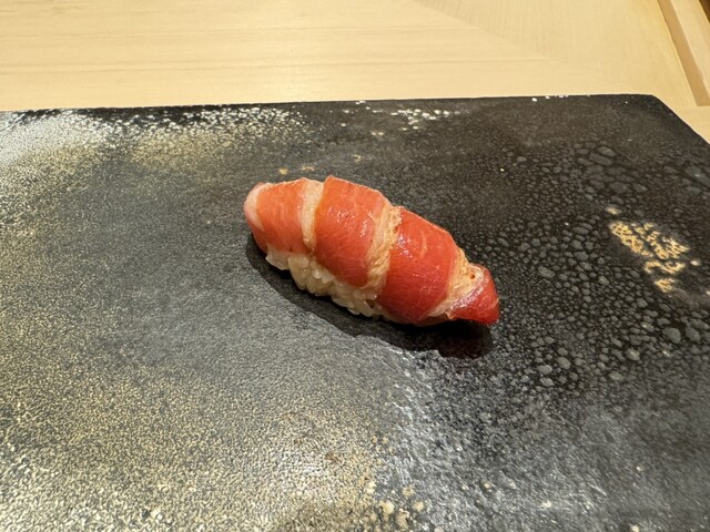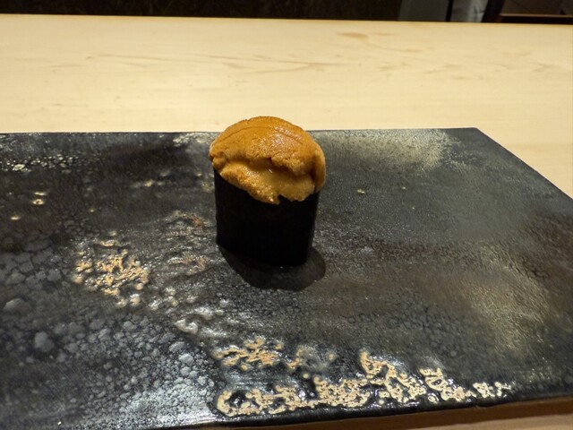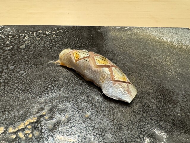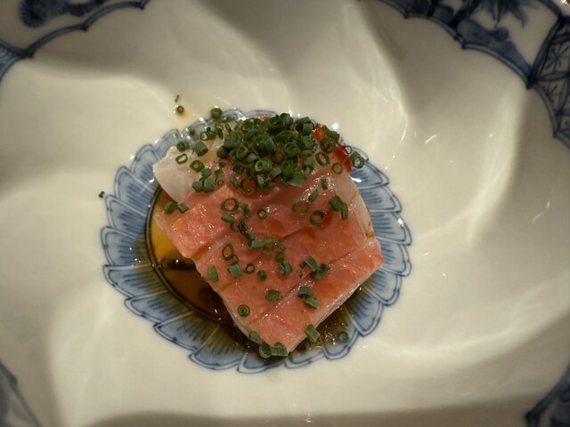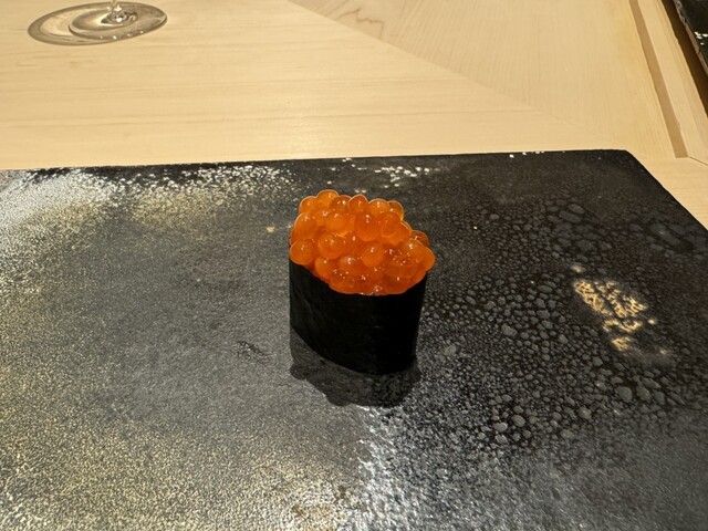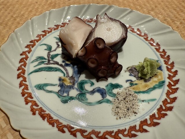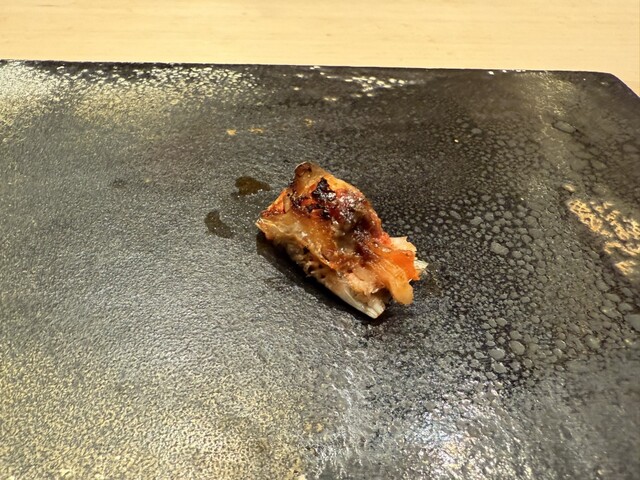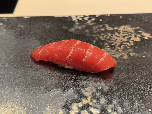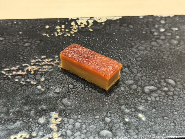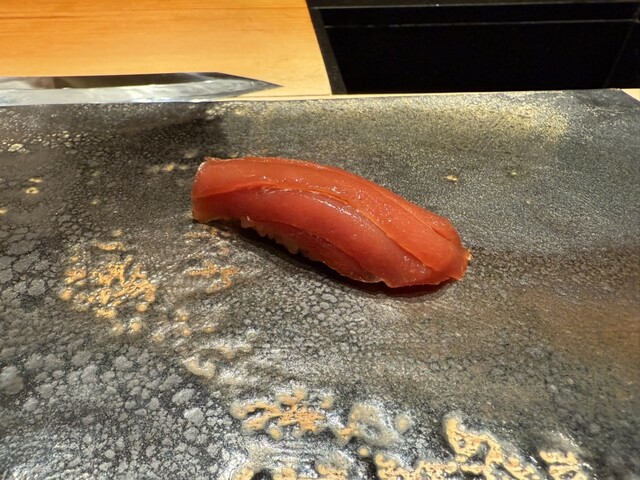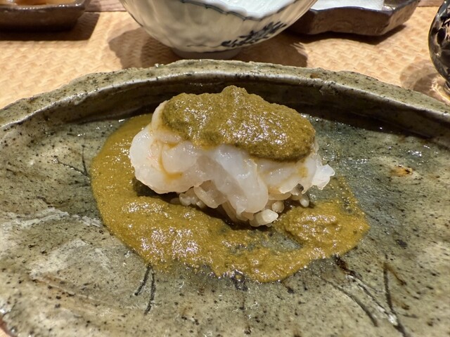 ヤイトガツオ、鰆、河豚の唐揚げと煮凝り、鰯、カワハギ、海鼠、鮟肝と柿、唐墨、小肌、天然車海老、越前蟹の茶碗蒸し、赤貝、馬糞雲丹、大トロ、赤身、中トロ、車海老の頭、雲子、干瓢巻き、スープ、卵焼き