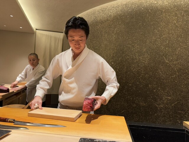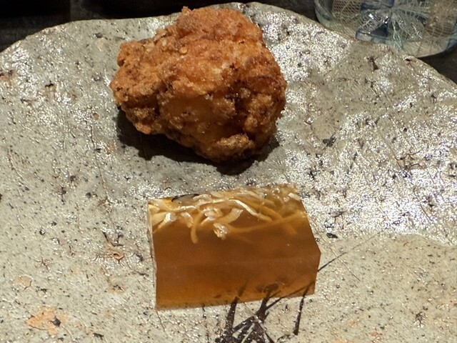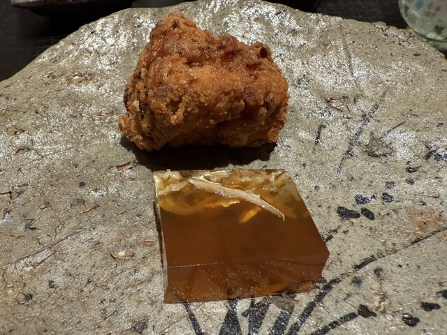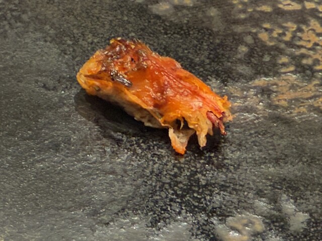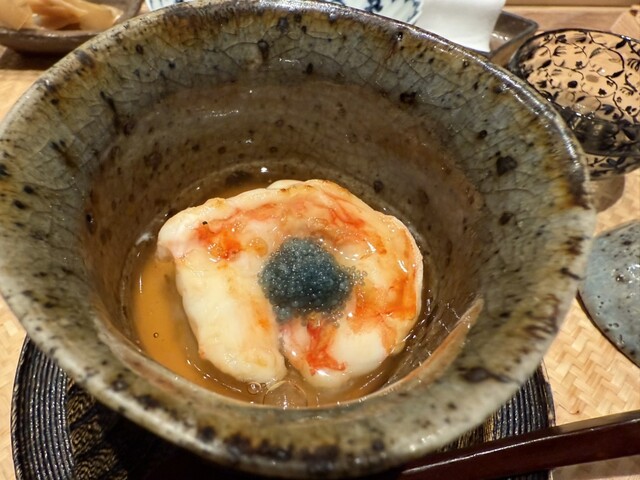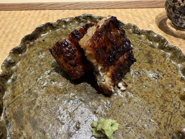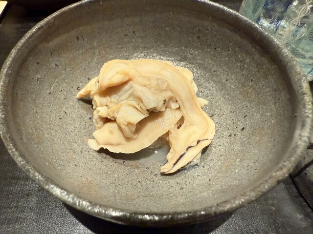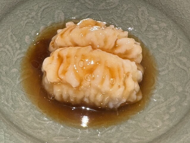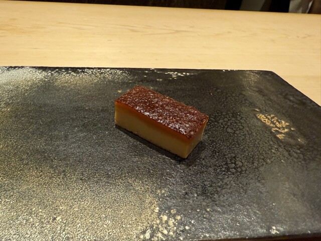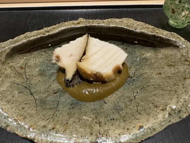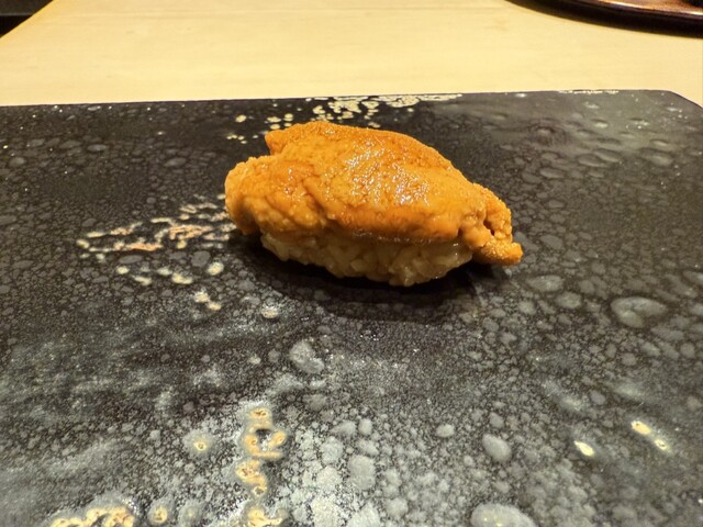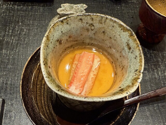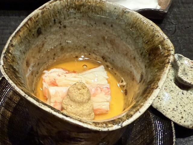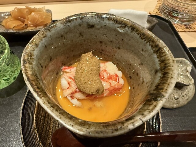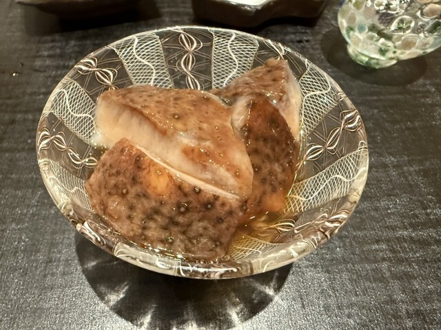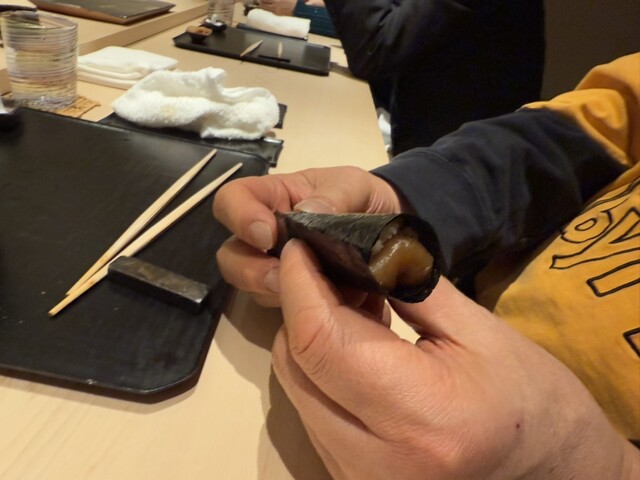 ヤイトガツオ、鰆、河豚の唐揚げと煮凝り、鰯、カワハギ、海鼠、鮟肝と柿、唐墨、小肌、天然車海老、越前蟹の茶碗蒸し、赤貝、馬糞雲丹、大トロ、赤身、中トロ、車海老の頭、雲子、干瓢巻き、スープ、卵焼き