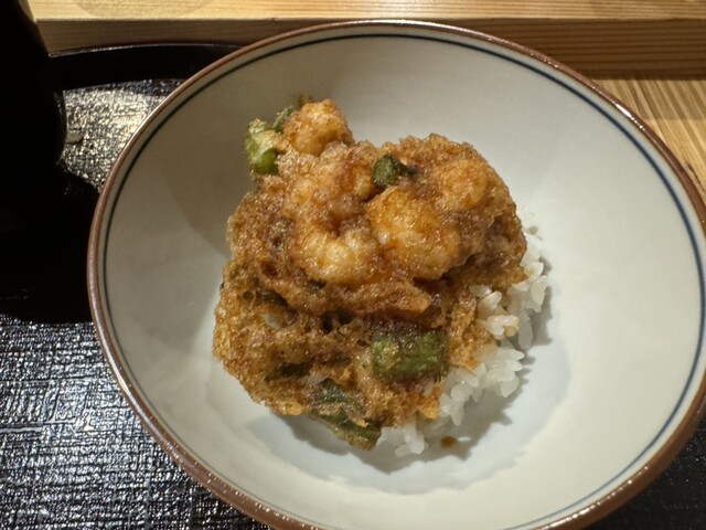 ハトシ、車海老、車海老、赤茄子、鱚、椎茸、新銀杏、西洋松茸、女鯒、南瓜、松茸、帆立、穴子、明太子、御御御付、かき揚げ丼