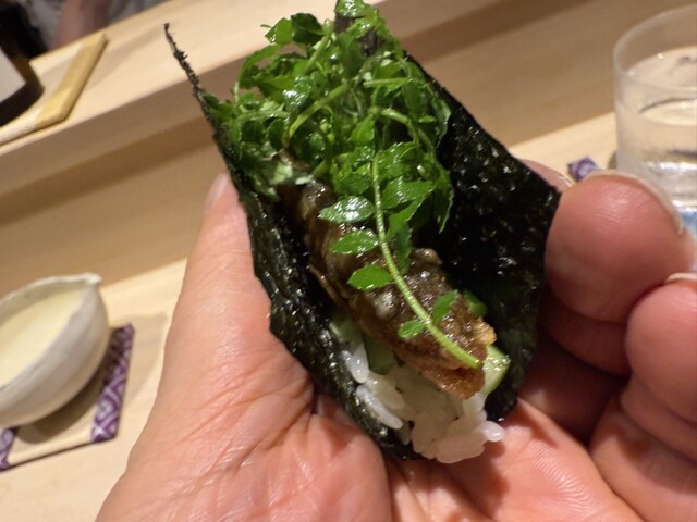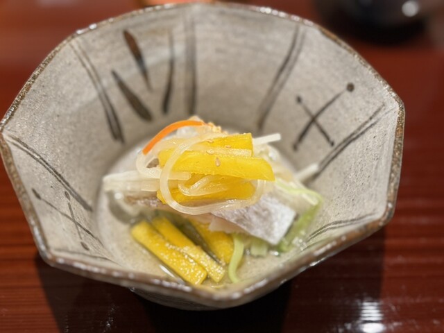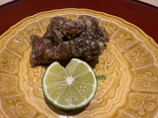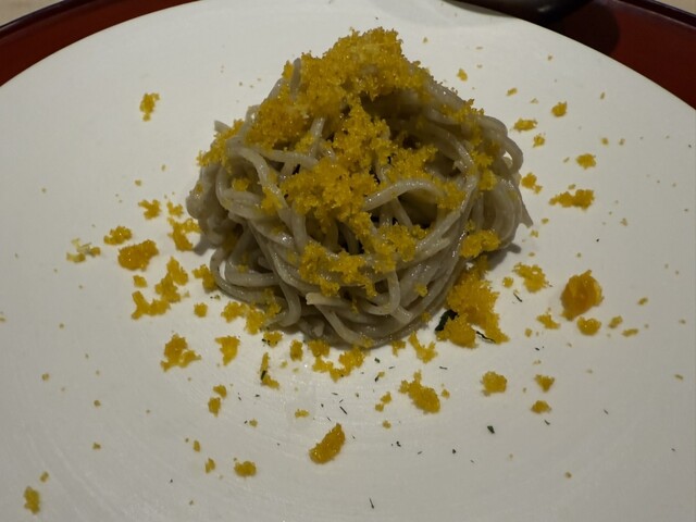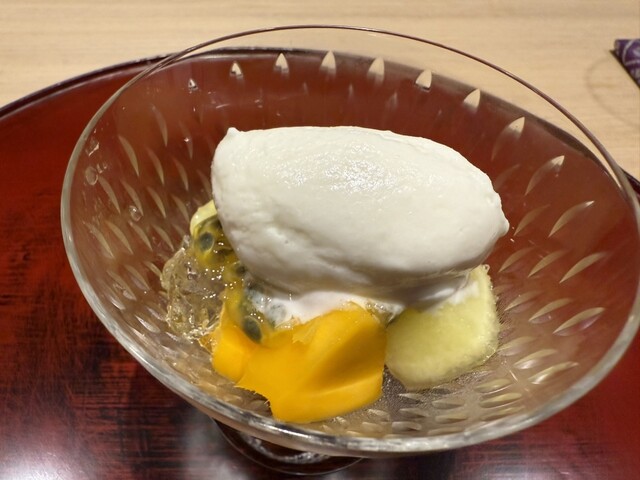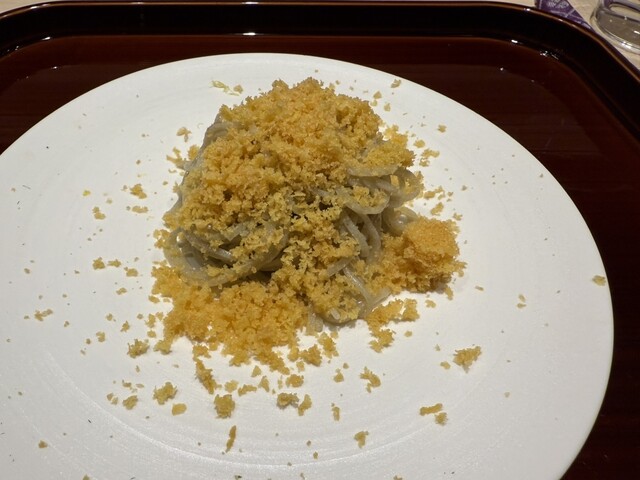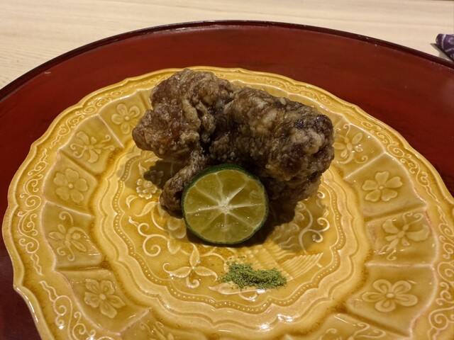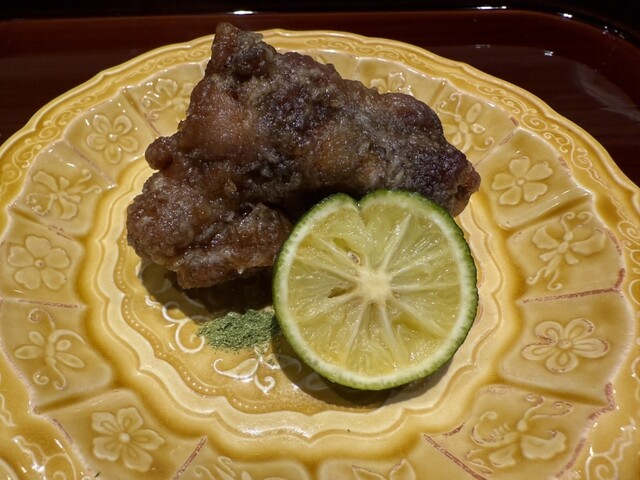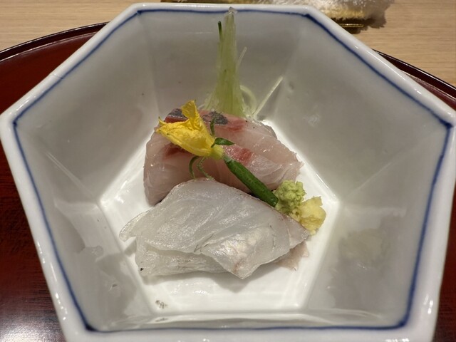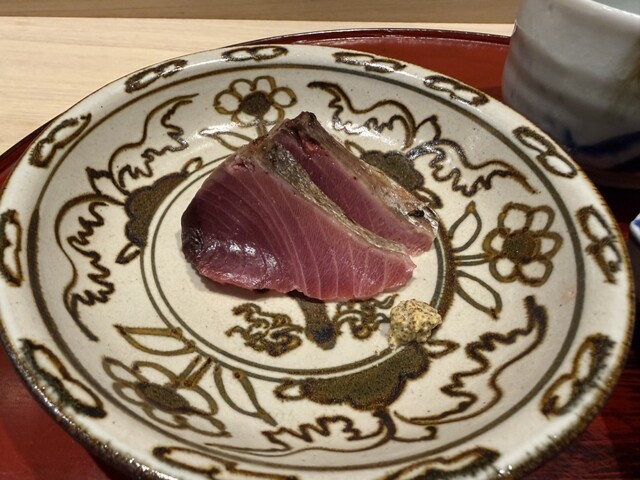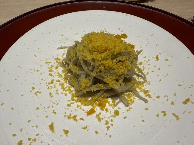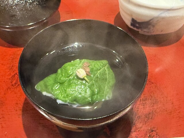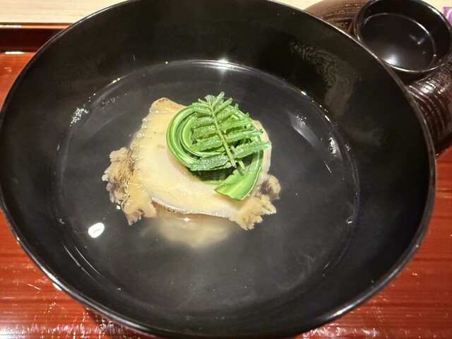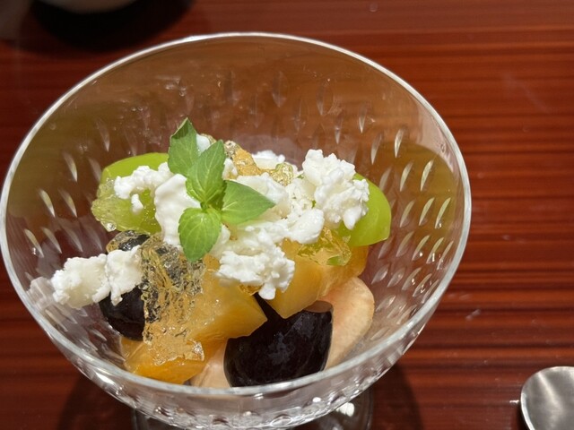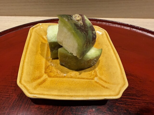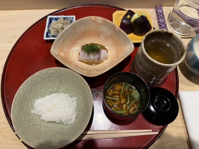 伊勢海老としめじのお浸し、鱧松茸のフライ、甘鯛と冬瓜のお椀、ヤイトガツオ、炙りヤイトガツオ、唐墨蕎麦と牡丹海老、鮎とイクラ、鼈の唐揚げ、無花果、鰊と茄子、水茄子、赤だし、松茸ご飯、松茸ご飯とイクラ、ココナッツミルクのアイスクリームとシャインマスカット、水羊羹