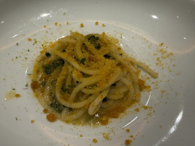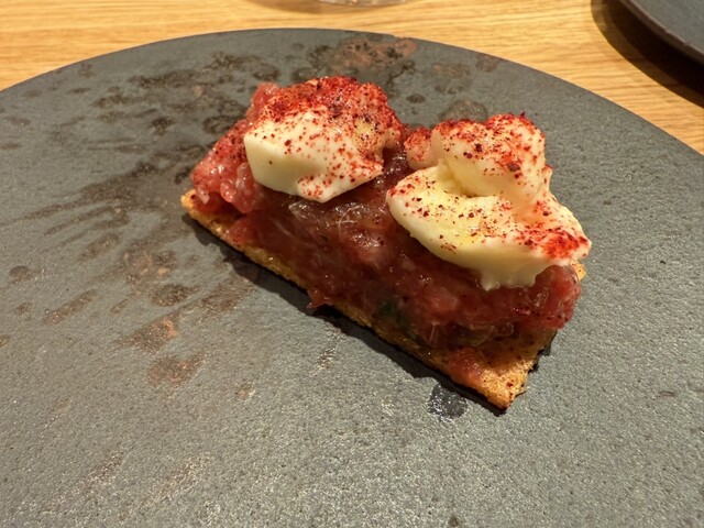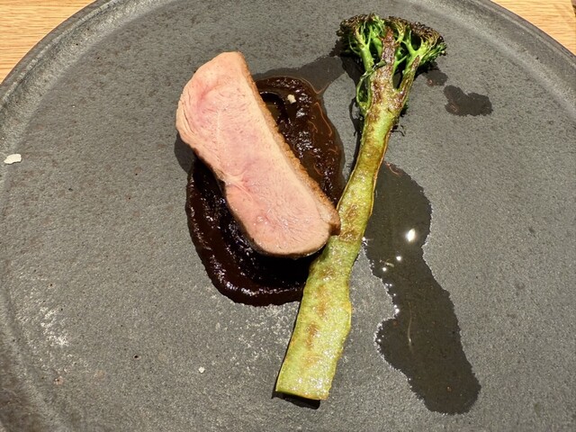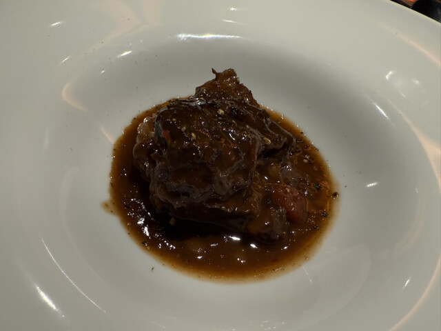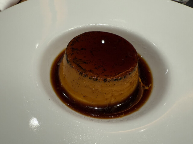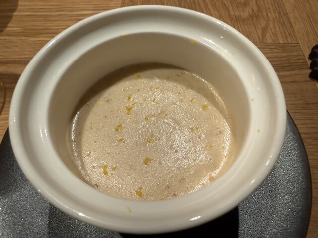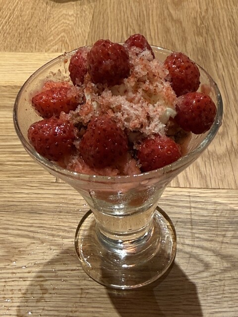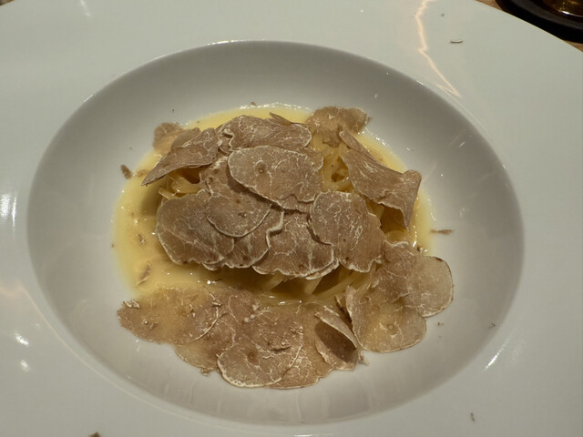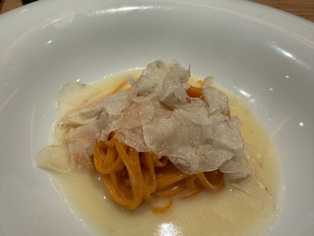 カリフラワーのポタージュ、寒鰤のカルパッチョ、但馬牛のタルタル白トリュフ掛け、真鱈の白子と椎茸の香草バターソース、白トリュフのタヤリン、唐墨のスパゲッティ、鴨の炭火焼き、苺のパフェ