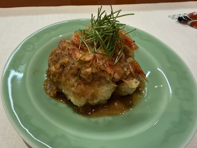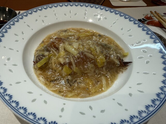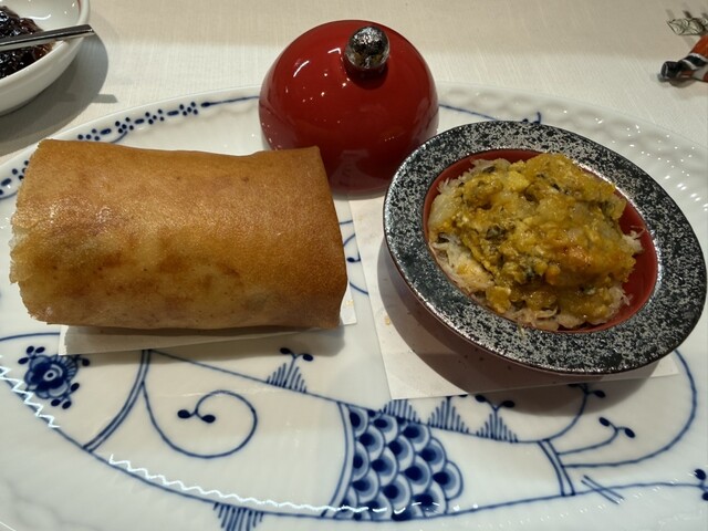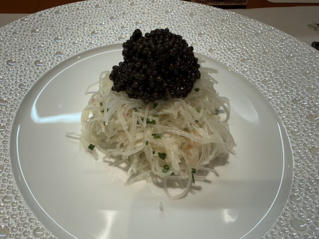 鱈の白子の揚げ物、鮑にトリュフ、キャビアと蟹、キャビアと蟹のビーフン、蟹の春巻きと上海蟹、上海蟹の紹興酒漬け、揚げ鱶鰭、蟹チャーハン、麻婆豆腐に河豚白子、ラーメン、苺とプラッターチーズ