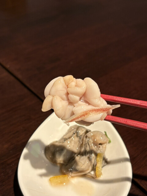 こちらは冷たい白子、そして生牡蠣。思わずせこちゃんの日本酒を少しもらって飲みました