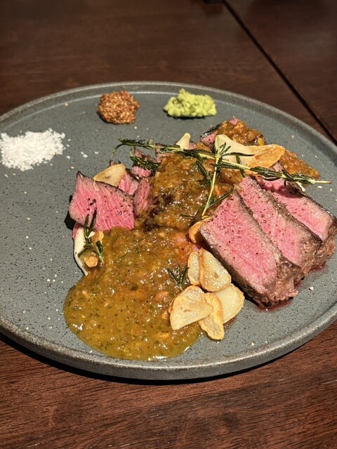 チミチュリソースという酸っぱ辛いソースや、粒マスタード、わさび、お塩をお好みで。