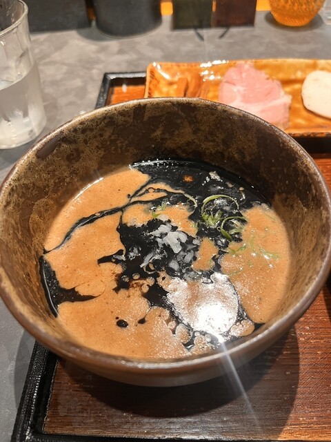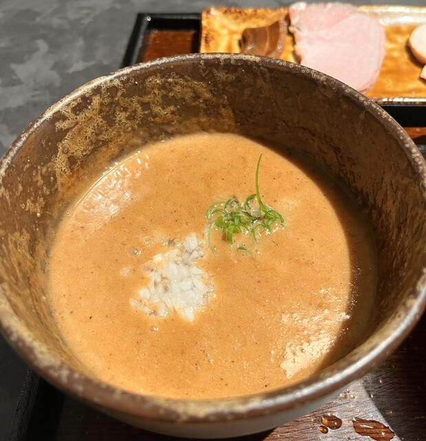 どろっ、というかコラーゲンのとろっとしたテクスチャーに豚骨のみならず鶏の旨味がたっぷりと溶けだし、魚介の旨味と風味がしっかりと寄り添うバランス感に感服。塩味はそこらの無骨なまたおま系とは異なりそのままでも美味しく頂ける上品なつけ汁となっているが麺をディップして食べても物足りなさは感じないという仕上がり。麺との相性も良く、どちらも相乗的な美味さを発揮しています。麺の主張に塩味が負けることはなく、かつスープの塩味、味わいによって小麦の甘みが映えるといった完璧なバランスです。